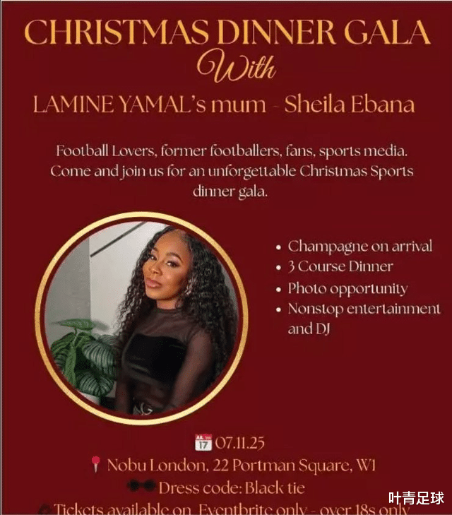 《马卡报》等媒体报道,亚马尔母亲Sheila Ebana将出席一场晚宴,时间定在11月7日,地点是伦敦Nobu酒店。作为晚宴的明星、主办人,Sheila Ebana制定了3档票价: