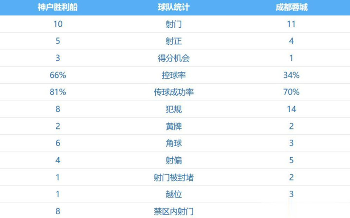 我们从全场的数据统计来看,成都队射门11-10还要领先对手,射正4-5基本上持平,即便成都队只有34%的控球率,他们踢得不畏首畏尾,敢于进攻、并且是能够创造出机会。