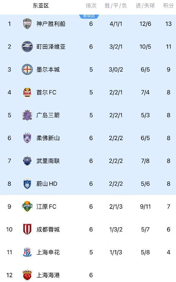最新的积分榜方面,在东亚区,海港队遭遇了6轮不胜、积2分继续垫底;成都队4轮不胜积6分排名第10位,都是在晋级区之外。